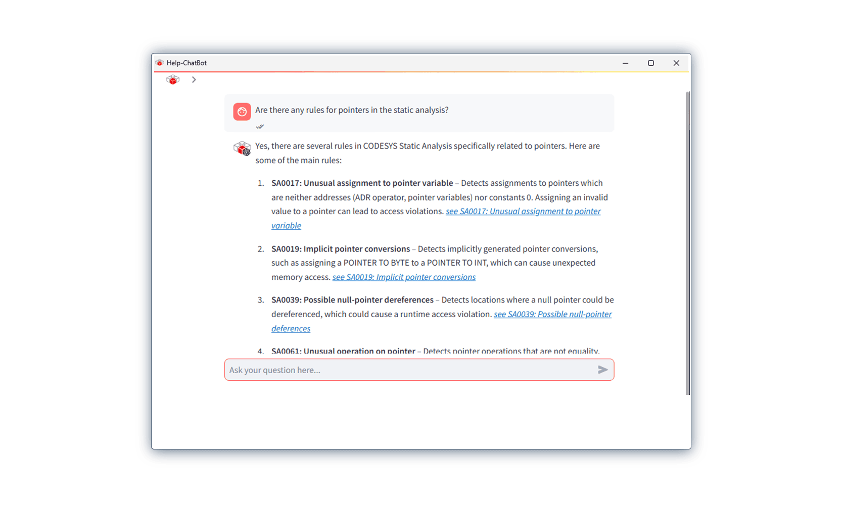 - Keine KI-Halluzinationen! Der Chatbot greift ausschließlich auf die CODESYS-Online-Hilfe zu. Er gibt kein Ergebnis zurück, wenn er dort keine passenden Informationen findet.